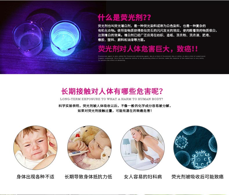 熒光劑不像一般化學成分那樣容易被分解,而是在人體內蓄積,產生許多有害的作用,大大削減人體免疫力;熒光劑與傷口外的蛋白質結合,還會阻礙傷口的愈合;熒光劑能使人體細胞出現變異性傾向,其毒性累積在肝臟或其他重要器官,會成為潛在的致癌因素。
