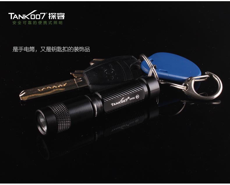 TANK007探客UV01熒光劑檢測365nm紫外線手電筒:1.UV01是一款便攜式迷你日用UV手電筒,使用一節AAA電池2.配合鑰匙扣可以方便掛于鑰匙串上隨身攜帶
