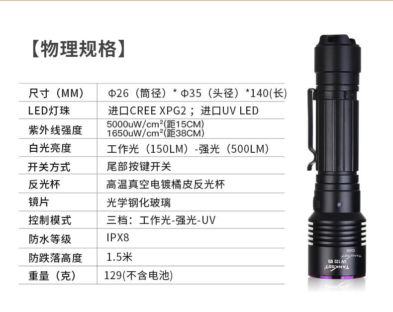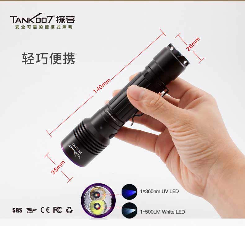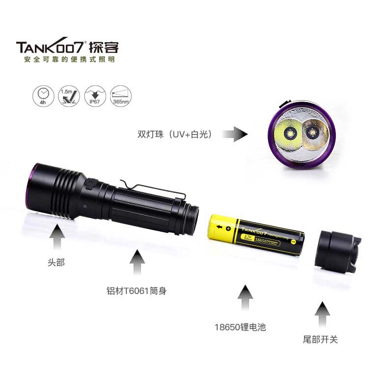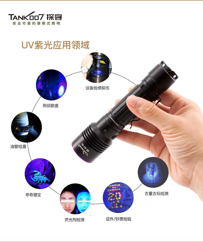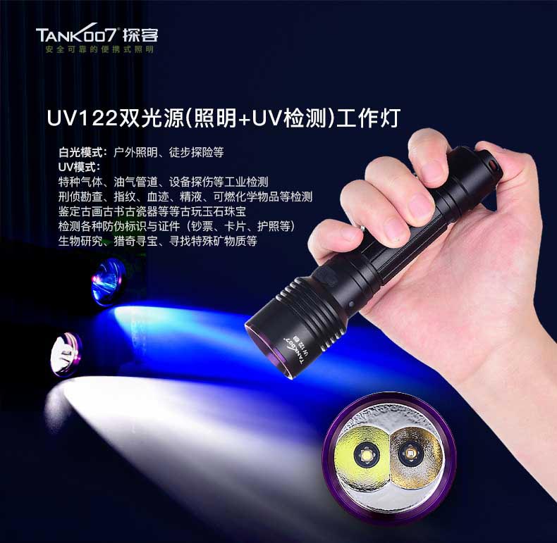 TANK007探客UV122雙光源強(qiáng)光手電筒/紫外線鑒定手電筒:適合戶外露營、徒步、探險、戶外搜救、NDT檢測、痕跡檢驗(yàn)、工業(yè)探傷、檢漏等 ,也適用于警察安防的驗(yàn)痕、血跡,作案現(xiàn)場的查勘,應(yīng)用特殊物質(zhì)...