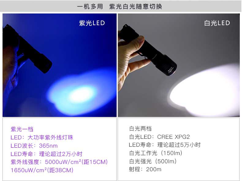 1.白光:CREE XPG2,紫光:大功率UV LED燈珠;使用18650鋰電池鋰供電