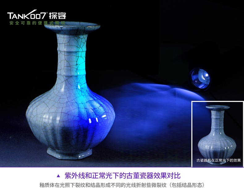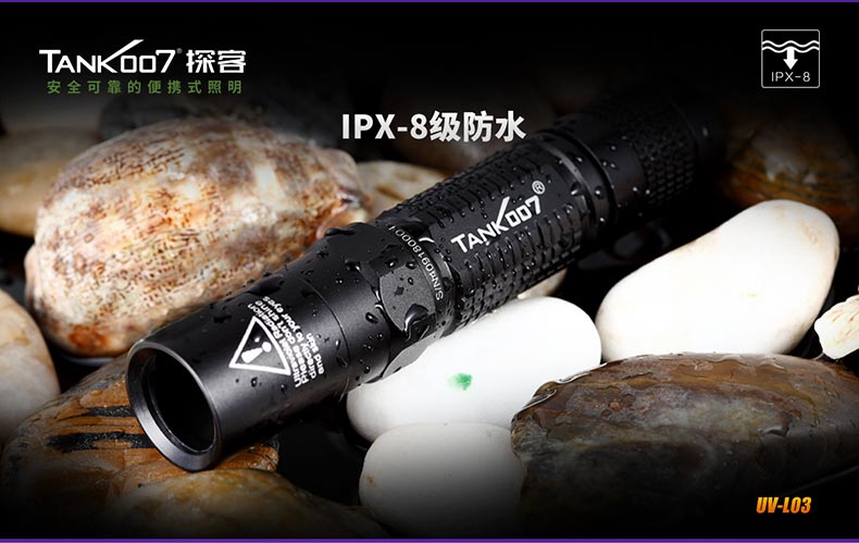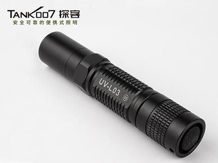 TANK007探客UV-L03大功率紫外線手電筒可充電紫外線手電:是一款便攜式UV手電筒,也是一款大功率紫外線鑒定手電筒使用一節18650可充電鋰電池,采用韓國紫光燈珠,波長準確,壽命長達2萬小時