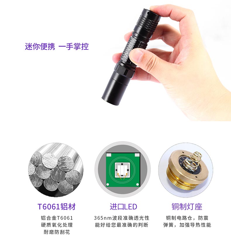 1. UV-L03是一款便攜式UV手電筒,也是一款大功率紫外線鑒定手電筒使用一節18650可充電鋰電池