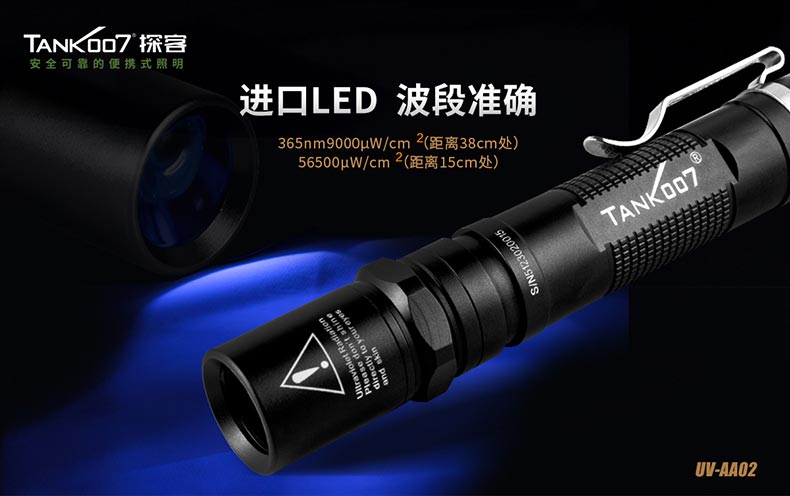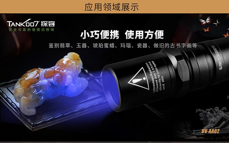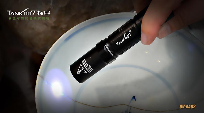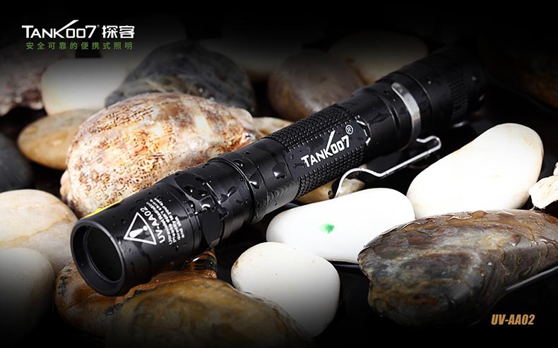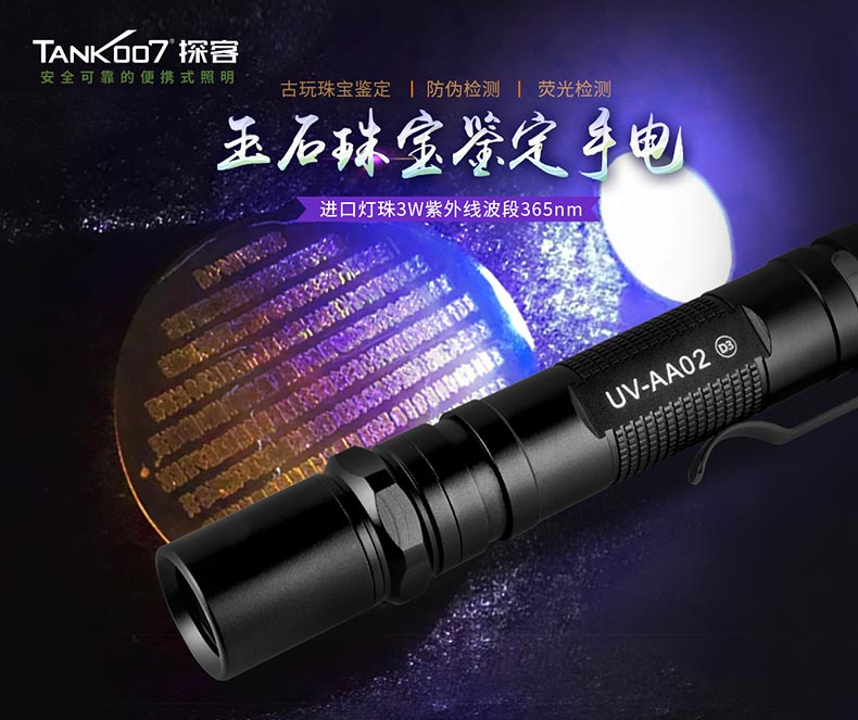 TANK007探客UV-AA02膠水固化/玉石鑒定充電紫外線手電筒:采用18650可充電鋰電池,適用于獵奇尋寶、古董鑒定和尋礦野外探察、油墨固化、UV膠水固化、防偽標識、鈔票辨真等特殊物質的熒光反射。