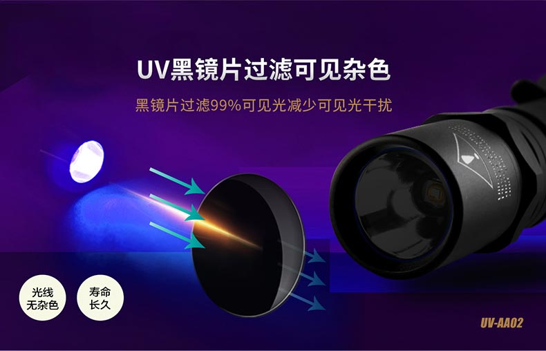 3.UV手電筒特制鏡片,有效過濾可見光,降低可見光干擾